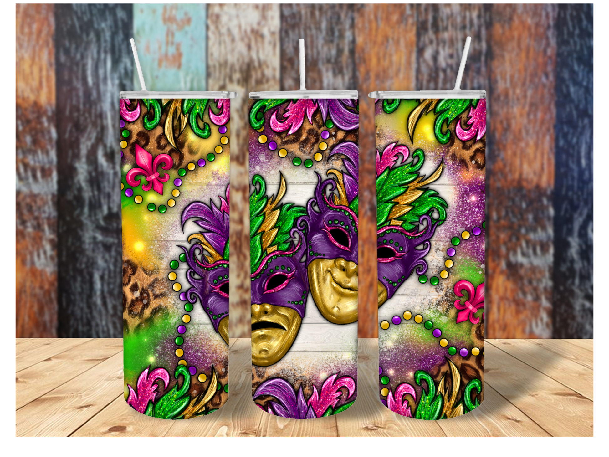 This vibrant 20-ounce Mardi Gras tumbler embodies the festive spirit of New Orleans. The stainless steel body features a glossy, colorful design with traditional Mardi Gras colors of purple, green, and gold swirling together in a playful pattern. Intricate designs of masks, beads, and fleur-de-lis symbols are scattered across the surface, capturing the essence of the celebration. The tumbler is double-walled and vacuum-insulated, keeping beverages hot or cold for hours. Whether you're at a parade, party, or just enjoying a day out, this tumbler is perfect for celebrating Mardi Gras in style.