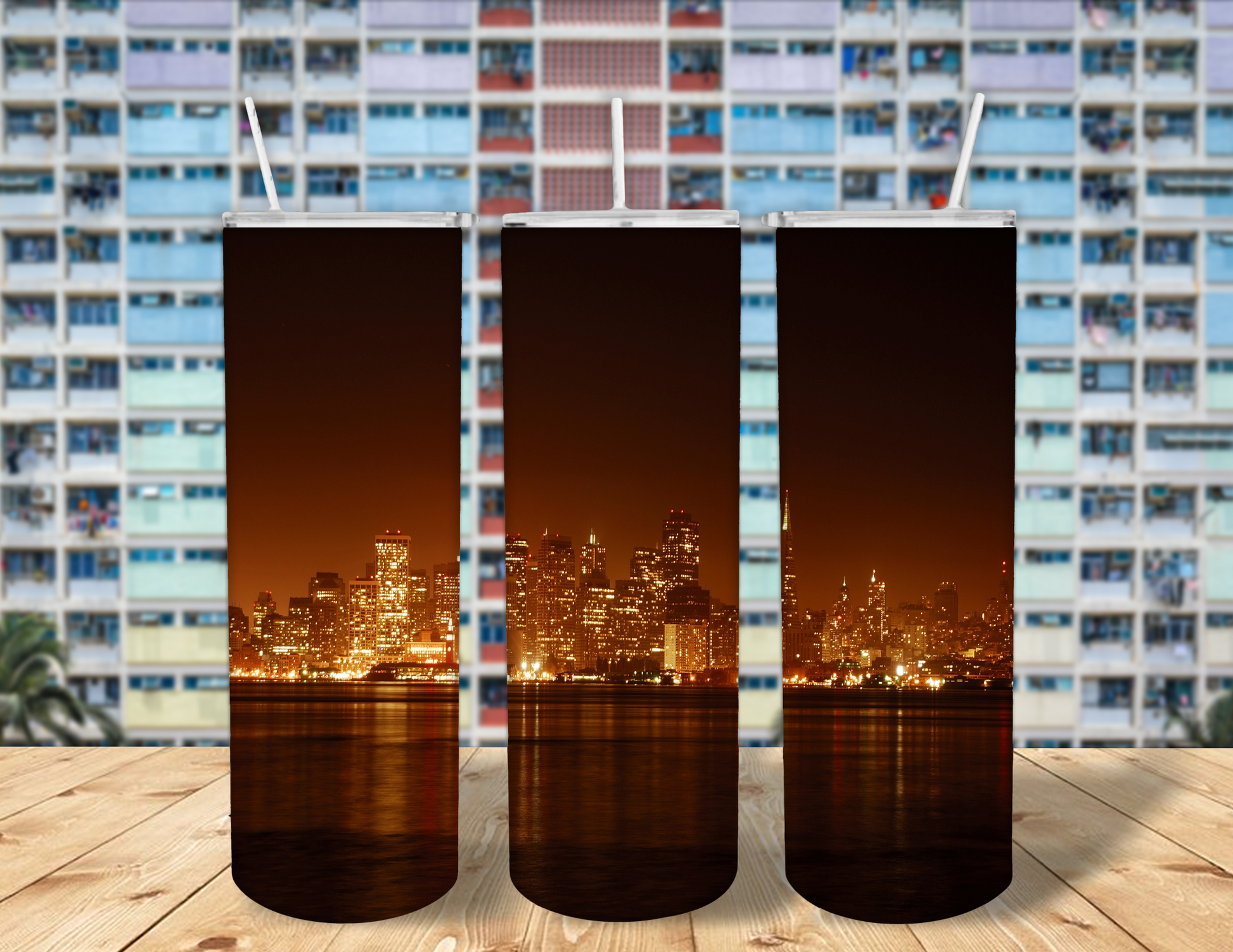 This 20-ounce tumbler captures the mesmerizing beauty of the New York City skyline after dark. The stainless steel body features a sleek, glossy finish with a striking nighttime design. The artwork showcases the iconic New York skyline, illuminated against a deep, starry night sky. The design highlights the energy and allure of the city that never sleeps, with subtle effects like glowing windows and sparkling stars adding to the nighttime ambiance. The tumbler’s double-walled, vacuum-insulated construction ensures that your beverages stay hot or cold for hours, making it a perfect accessory for those who want to carry a piece of the city’s nighttime magic wherever they go.