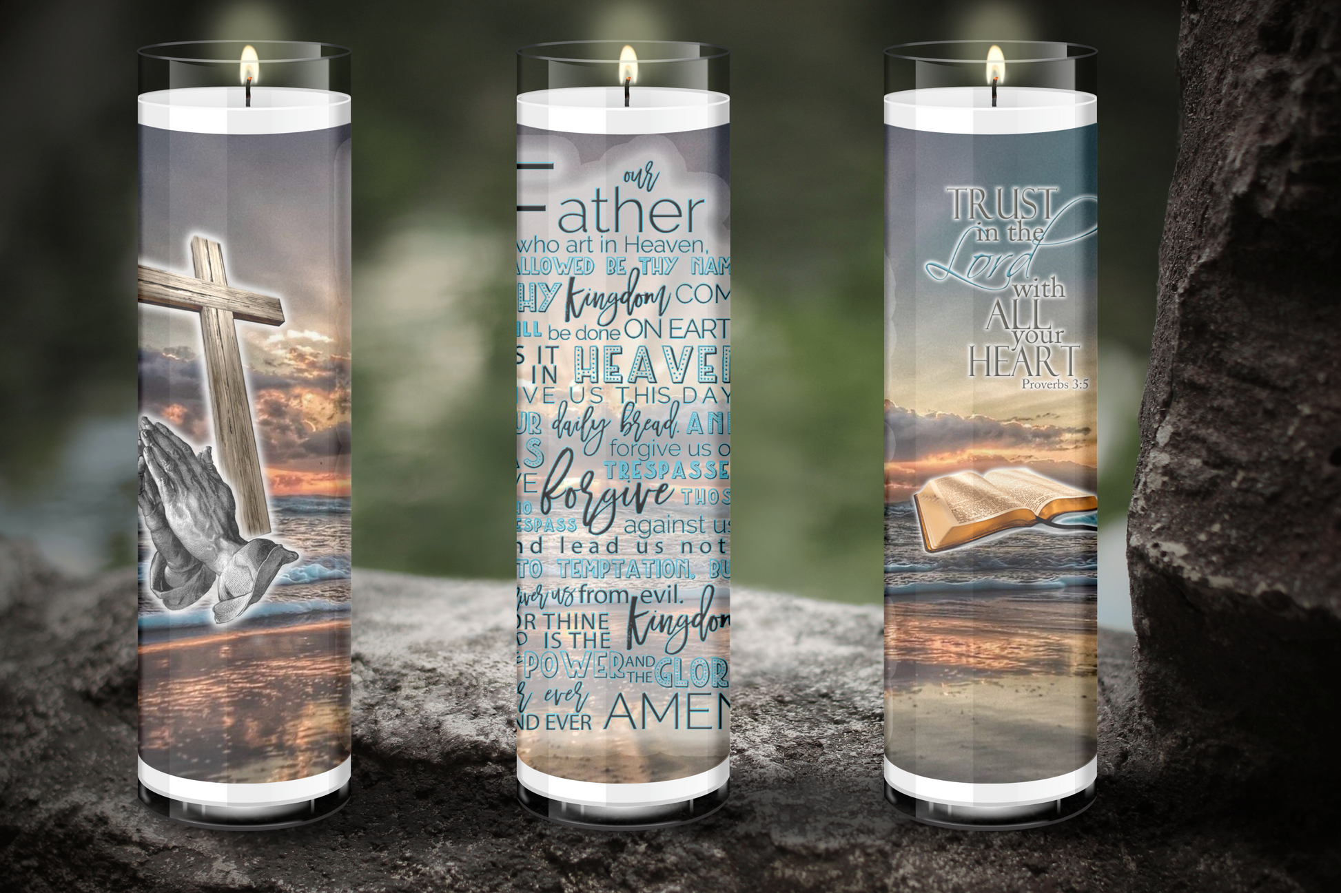 A The Lord's Prayer Prayer Candle is a devotional candle that features one of the most well-known and cherished prayers in Christianity, "The Lord's Prayer." Here's a detailed description: