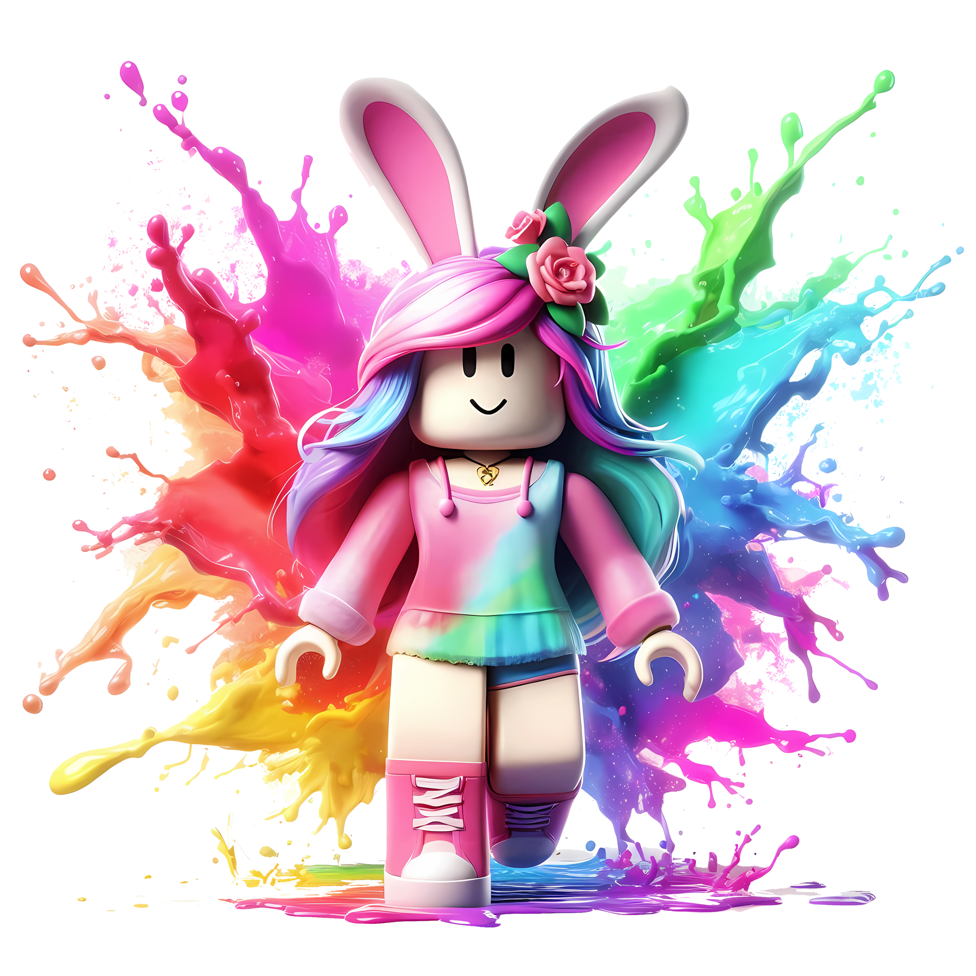 Design: Colorful bunny-gamer character with rainbow splashes