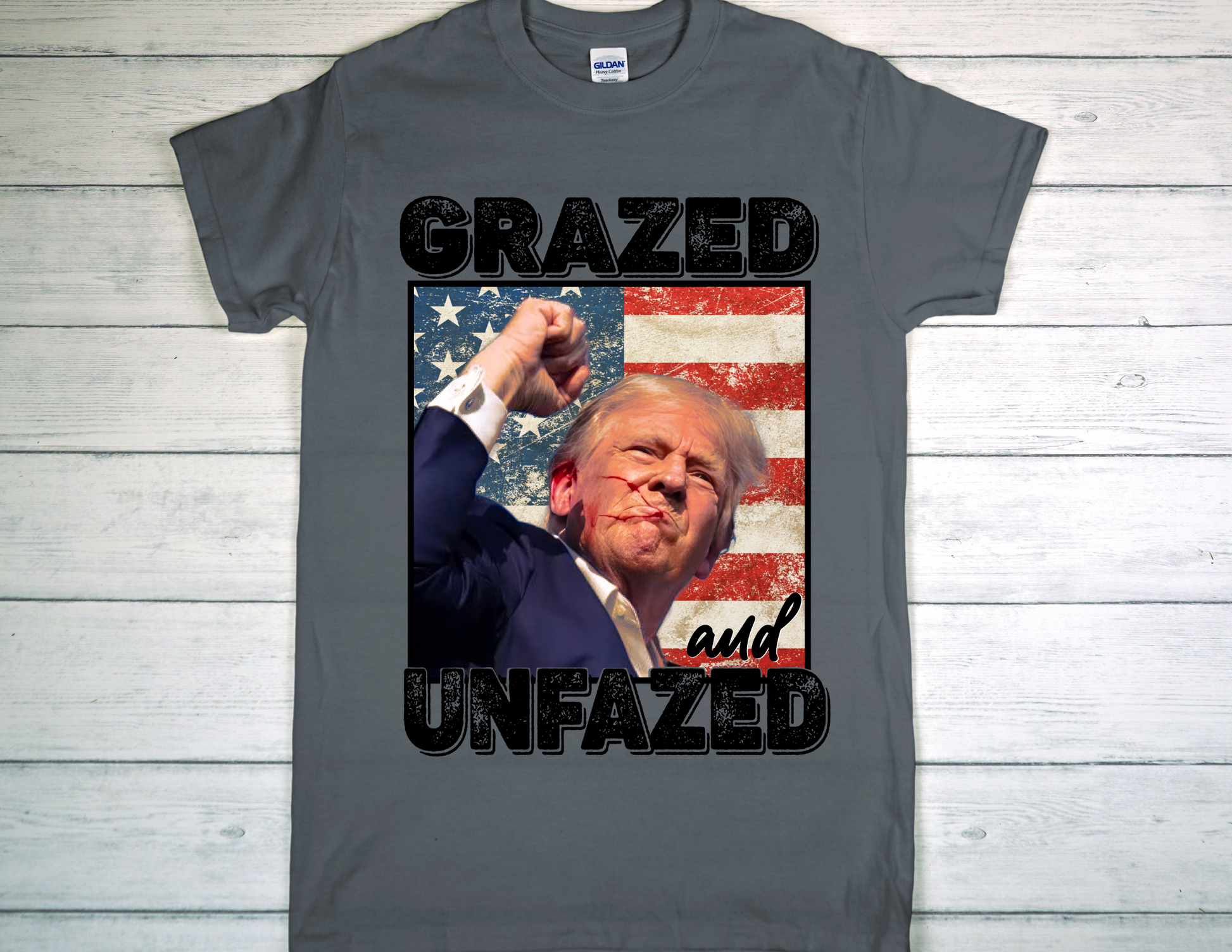 This bold and satirical t-shirt makes a statement with both humor and style. Made from soft, premium cotton, it offers a comfortable fit and lasting durability for everyday wear. The graphic design features a caricature of Donald Trump with the phrase “Grazed and Unfazed” prominently displayed, capturing his resilient persona. The artwork may show him in a confident or nonchalant pose, with playful or symbolic elements that reflect the "unfazed" attitude. Available in various colors, this graphic tee is perfect for those who appreciate political humor, satire, and a unique twist on current events. Ideal for casual wear, it’s a conversation starter and a standout addition to any wardrobe.