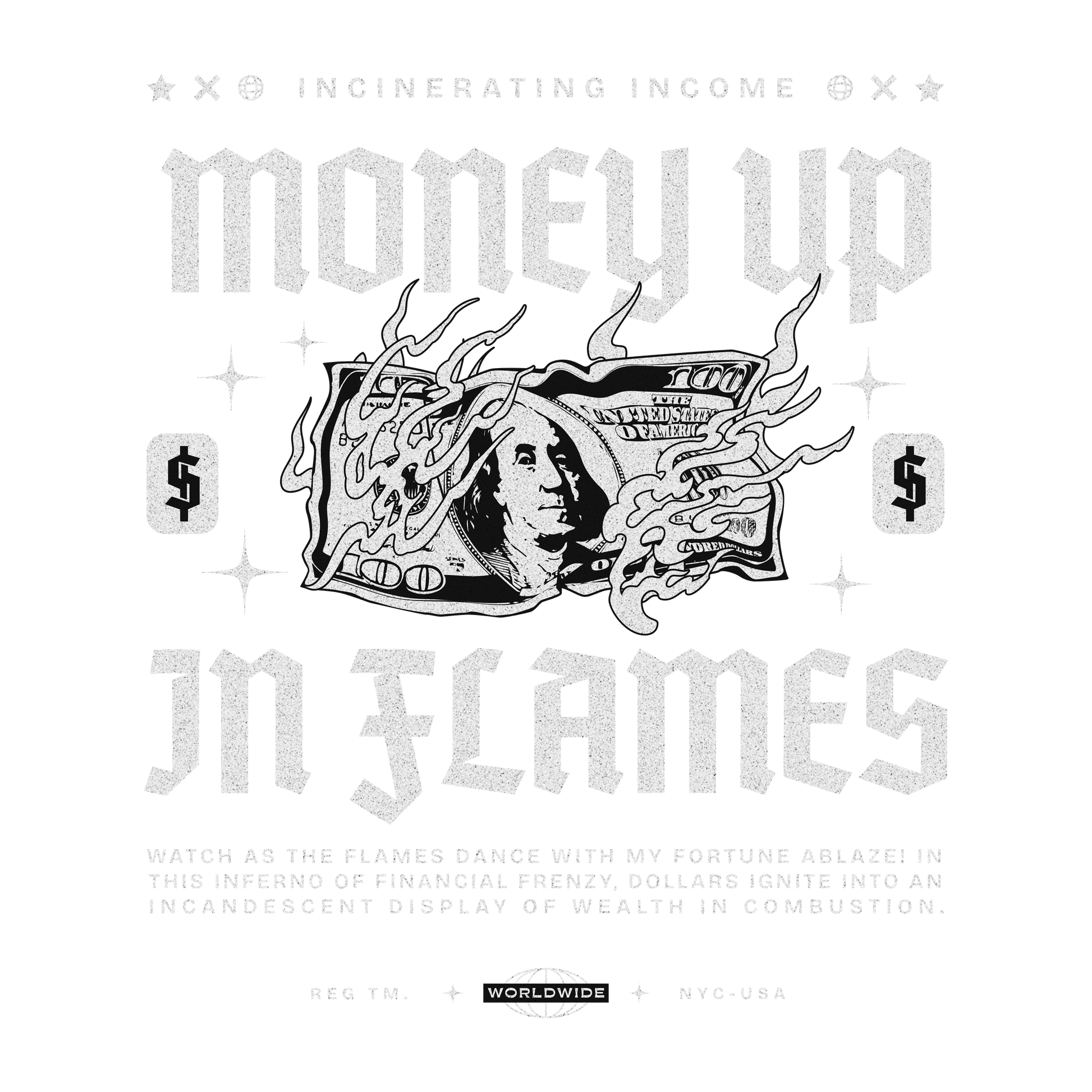 Turn heads with our 'Money Up in Flames' t-shirt, a powerful design that captures the fleeting nature of wealth. Featuring a striking graphic of cash burning in flames, this shirt is a bold reminder that money isn't everything and can vanish in an instant. Perfect for those who live by their own rules and aren’t afraid to challenge the status quo, this t-shirt is made from soft, high-quality cotton for comfort and durability. Wear it as a statement piece and ignite conversations wherever you go.