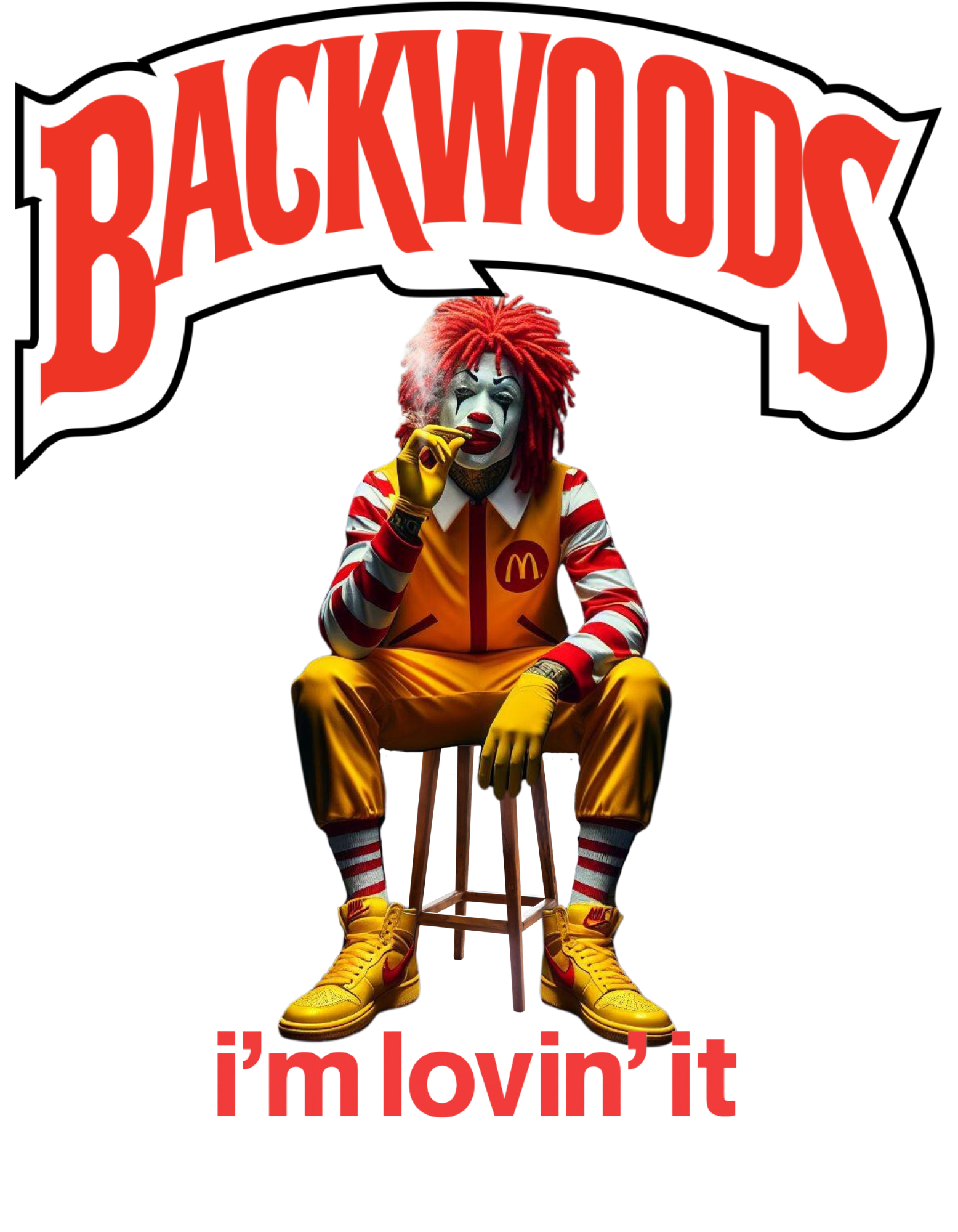 This t-shirt combines a playful nod to pop culture with a humorous twist. Made from soft, high-quality cotton, it offers comfort and durability for everyday wear. The design features Ronald McDonald in a whimsical, relaxed pose, enjoying a moment with a backwoods theme, while the phrase “I’m Lovin’ It” is prominently displayed in bold, eye-catching font. The graphic might include fun, creative elements like a playful background or additional quirky details to enhance the design's lighthearted nature. This t-shirt is perfect for those who enjoy a touch of humor and irony, making it a great choice for casual outings or as a unique conversation piece.