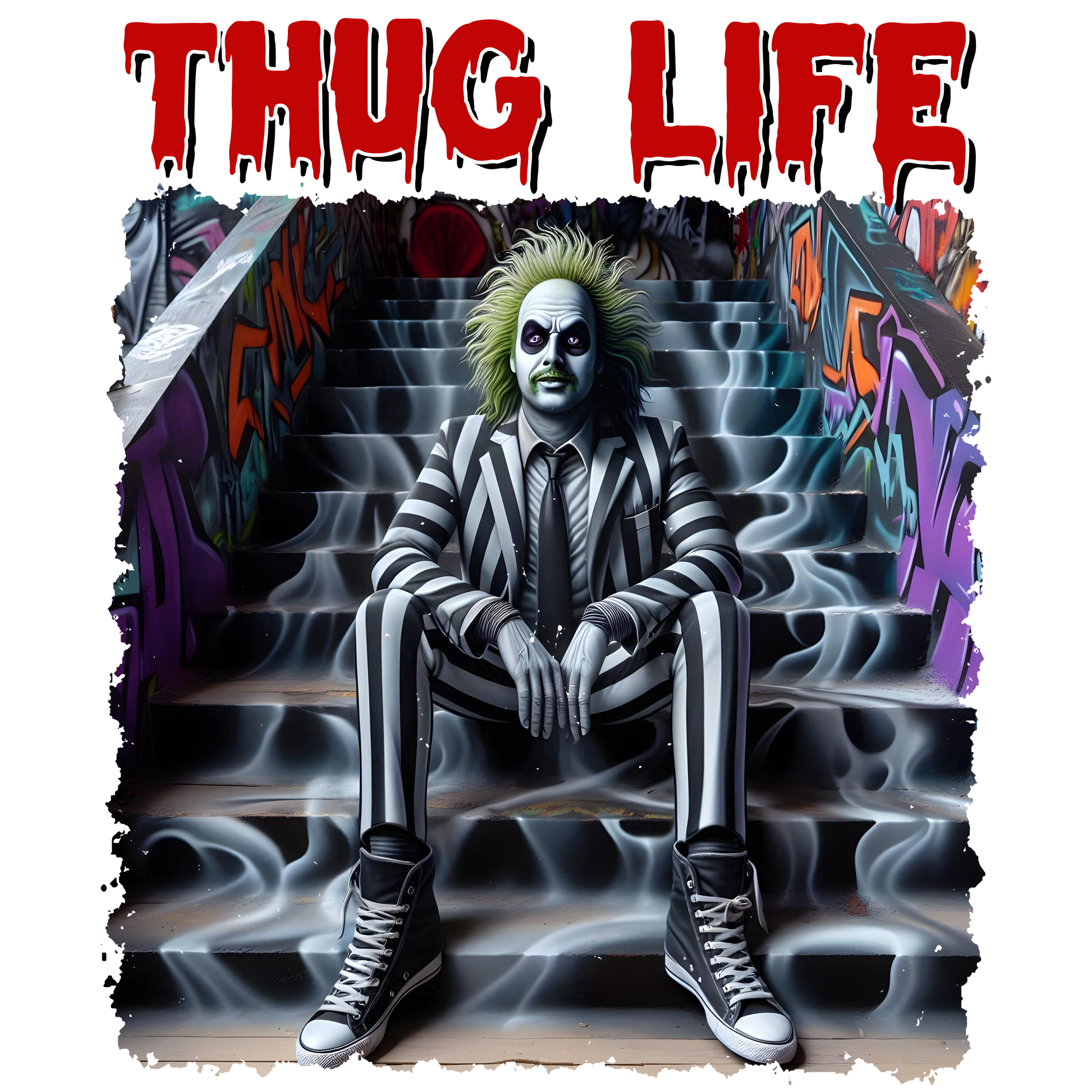 Crafted from soft, high-quality cotton, this t-shirt offers a comfortable fit that’s ideal for everyday wear. The bold graphic features a captivating blend of horror motifs and street-style flair, capturing the essence of the thug life while adding a twist of dark, urban aesthetics. Whether you're chilling with friends, hitting the streets, or attending a late-night event, this shirt is sure to turn heads.