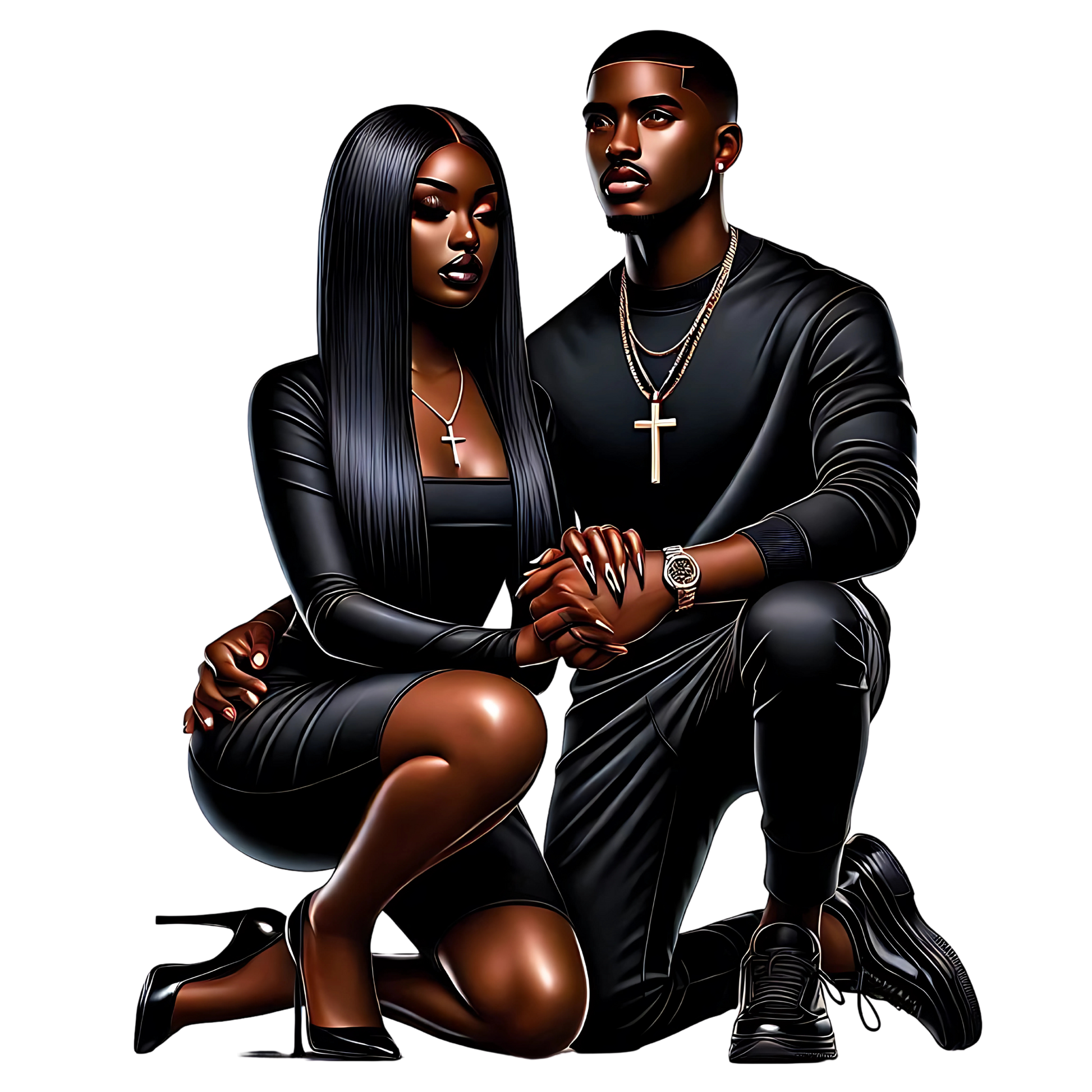 This image features a black couple, both dressed in casual all-black clothing, wearing urban hoodies. They both have crosses around their necks, adding a subtle yet significant symbol of faith. The couple is kneeling together on one knee, holding hands, which suggests a deep sense of unity, love, and reverence. The moment captured might symbolize shared strength in their relationship, as well as a mutual devotion to their faith. The combination of casual, urban fashion with the spiritual symbolism of the crosses and the intimate, respectful posture creates a powerful and modern representation of both love and faith.